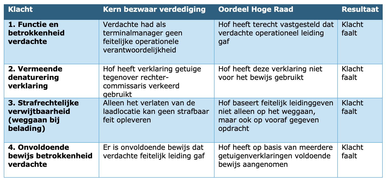 De Hoge Raad verwerpt het cassatieberoep dat zich richt op bewijsklachten over de betrokkenheid van de verdachte. Het hof heeft terecht vastgesteld dat de verdachte als terminalmanager operationeel leiding gaf. Het feit dat de verdachte het terrein verliet, vormt samen met zijn eerdere opdracht strafrechtelijk verwijtbaar handelen. Meerdere getuigenverklaringen bevestigen dat de verdachte actief druk uitoefende om de gevaarlijke belading door te laten gaan. Het hof heeft de bewijsoverwegingen voldoende gemotiveerd en juridisch correct opgebouwd. Er is geen sprake van denaturering of onjuiste interpretatie van verklaringen. De veroordeling blijft in stand, het beroep wordt verworpen.