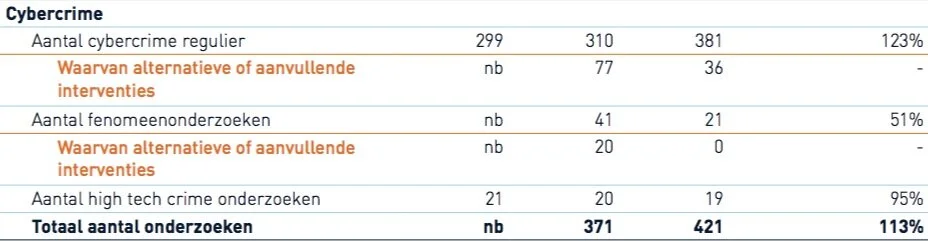 In 2019 werden 381 verdachten door het OM vervolgd; 71 meer dan de doelstelling voor 2019. Verder zijn 19 hightechcrime-onderzoeken afgerond, waarmee de doelstelling van twintig onderzoeken dicht is genaderd.
